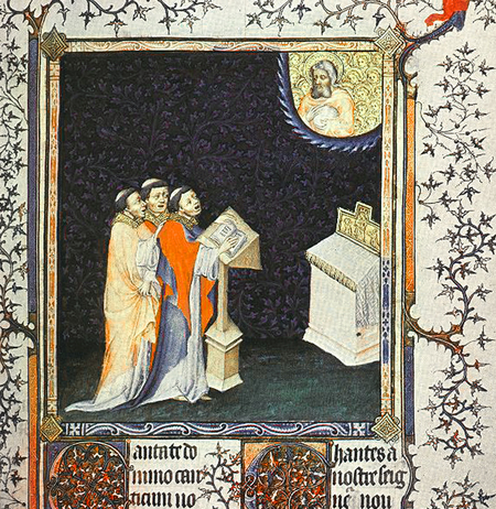 Монахи, поющие службу по Оливетанскому градуалу. Италия (Ломбардия), ок. 1439–1447 гг. Йельский университет, Библиотека редких книг и рукописей Бейнеке, MS 1184