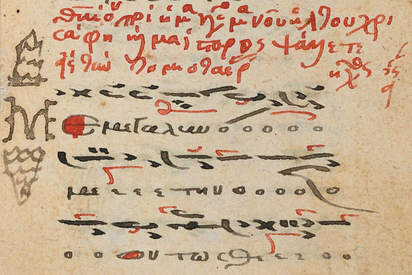 Национальная библиотека Греции, манускрипт 2458, 1336 г. от Р.Х., л. 3 об., фрагмент (копия), записанный поздней средневизантийской нотацией.