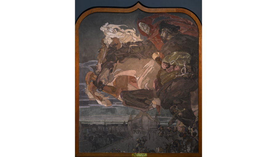 Напротив бронзовой скульптуры в стене встроен витраж «Приезд рыцаря» или «Встреча рыцаря-победителя» в неоготическом стиле, созданный в 1896. Витраж имеет четырехместную композицию. Сюжет простой: рыцарь возвращается после боя и его встречают прекрасные дамы с цветами. В чертах рыцаря некоторые также заметили автопортретные черты Врубеля. Средневековый сюжет витража соответствует стилю и атмосфере всего особняка, само обрамление витража имеет готический-неоготический стиль за счет характерных арочных композиций и орнаментов. Они напрямую перекликаются с оформлением витражного стрельчатого окна в пол напротив, на следующем лестничном пролете. Витраж был сильно поврежден в 1995 году при пожаре, но после реставрировался в Англии. Также сохранилась репродукция эскиза 1895 года.