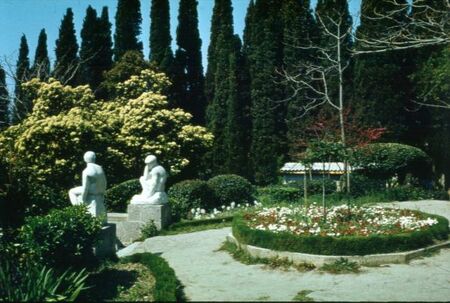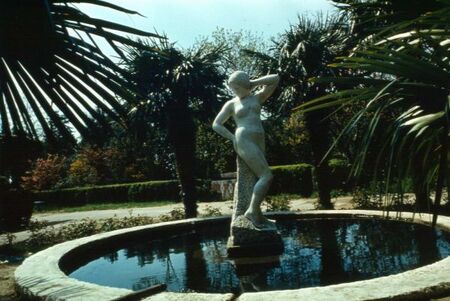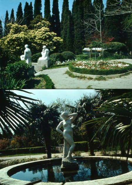 Площадка между главным домом и лестницей со скульптурами Матвеева. Фото 1980-х гг. Бассейн и статуя «Рождение Нимфеи». Фото 1980-х гг. Собрание семьи Жуковских.