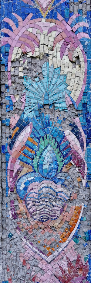 Главный дом. Западный фасад. Майоликовая композиция по эскизу Кузнецова. (Фотография Б. М. Соколова. 2002.) Главный дом. Восточный фасад. Пейзажная композиция по эскизу Кузнецова.