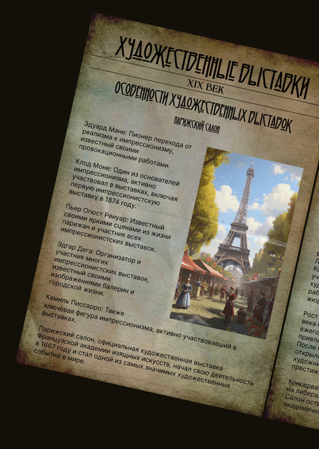 Две основные формы выставок — Парижский салон и Всемирные выставки — оказали значительное влияние на развитие искусства и культуры, предоставляя художникам возможности для самовыражения и взаимодействия с широкой аудиторией.