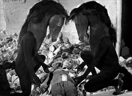 Продолжает этот мотив своеобразность некоторых второстепенных образов, где актеры опять же, больше выступают в роли оживших символов. Например, в «Завещании Орфея» образ человека-коня, представляющий что-то среднее между пегасом и кентавром, является аллегорией ангела смерти (в поэтике Кокто пегас дарует поэтам вдохновение, а кентавр соединяет мир жизни и смерти). Схожую роль выполняют и мотоциклисты свиты Смерти в «Орфее», но помимо этого их кожаные куртки и массивные очки отсылают к образам оккупации и послевоенных лет, создавая «мифологию» современного для Кокто ужаса.