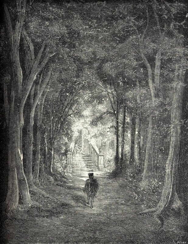 1. кадр из фильма «Красавица и чудовище» (1946 г., реж. Кокто) 2. иллюстрация к сказке «Спящая красавица» «Дорога в лесу» (1862 г., Доре)