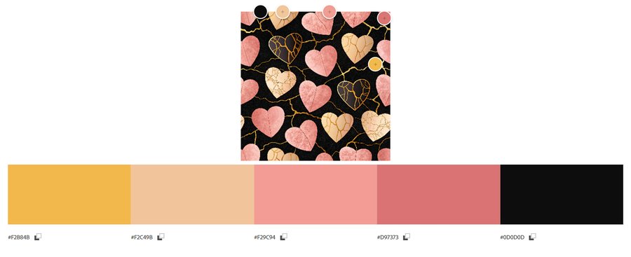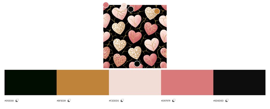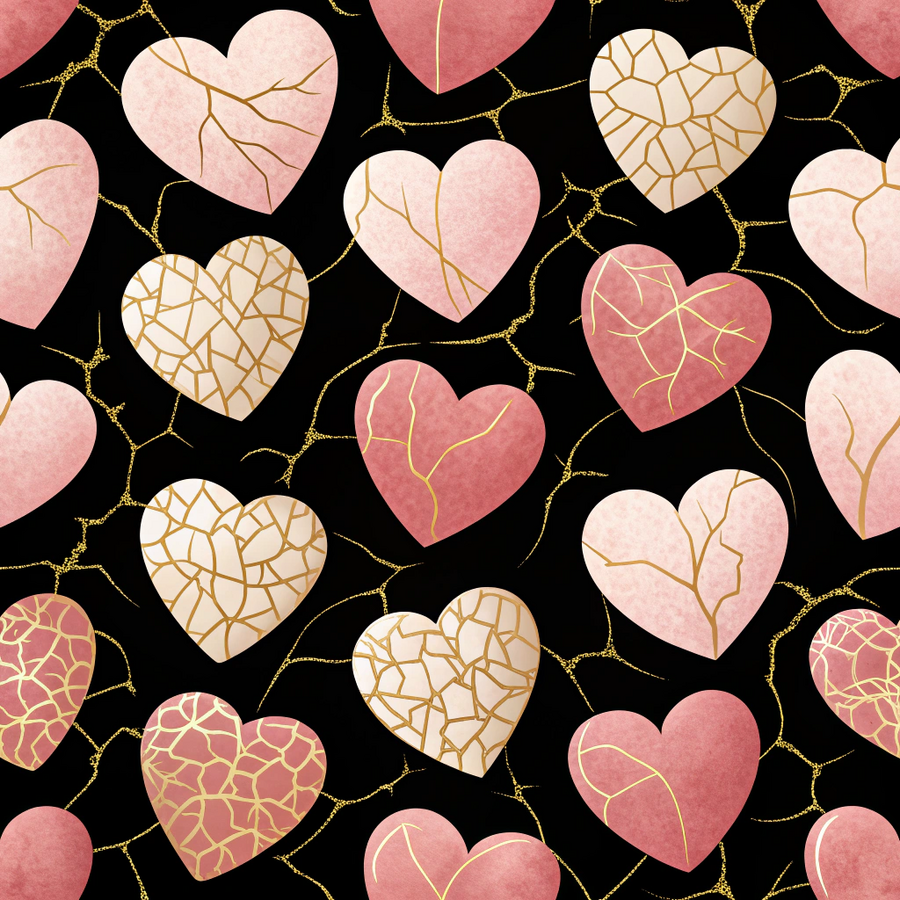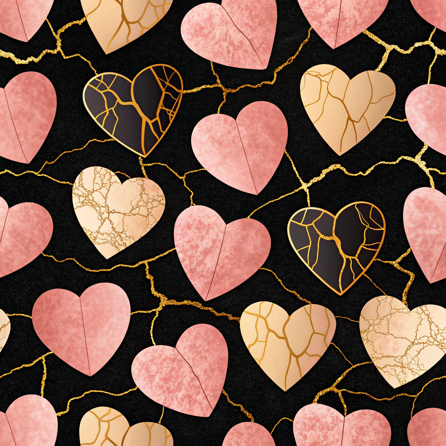 prompt: minimalist seamless pattern with hearts and golden kintsugi scars. color palette: rose and gold. no texture or shadows, focus on clean and brutal lines. black background and smooth minimalism