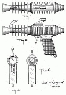 «Саул нагнулся за портфелем, и у него из-за пазухи выскользнул и тяжело шлепнулся на траву большой черный предмет. Антон поднял брови. Вадим пригляделся и тоже поднял брови. Это был скорчер — тяжелый длинноствольный пистолет-дезинтегратор, стреляющий миллионовольтными разрядами. Такие предметы Вадим видел только в кино. На всей Планете было не больше сотни экземпляров этого страшного оружия, и оно выдавалось только капитанам сверхдальних десантных звездолетов». — Попытка к бегству (Миры братьев Стругацких).