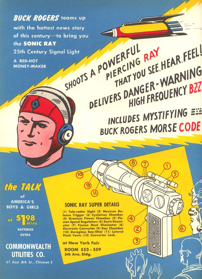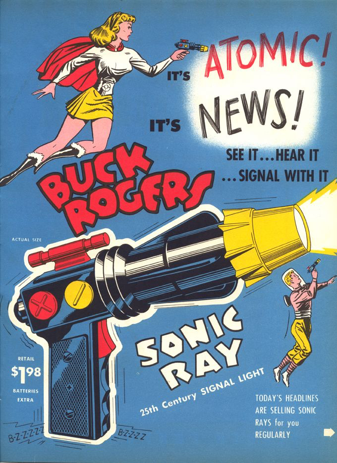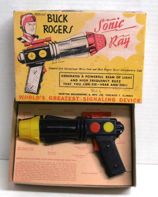 Фонарик-лучемет Buck Rogers Sonic Ray Gun был выпущен компанией Norton-Honer Mfg Co. в середине 1950-х годов. Он был очень популярен в момент своего появления и породил множество похожих игрушечных лучеметов, включая Super Sonic Ray Gun, выпущенный несколькими годами позже тем же производителем. Длина 7,5 дюймов.