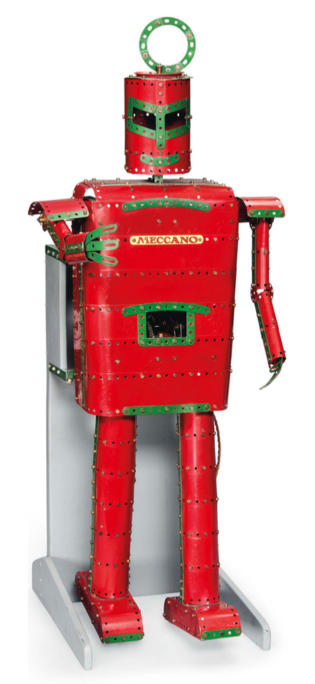 Конструктор Meccano появился на рубеже XX века, когда Фрэнк Хорнби, механик из Ливерпуля, изобрёл и запатентовал новый набор для сборки игрушечных моделей. В 1926 году, в честь годовщины своего патента, Хорнби представил «Meccano in Colours» с характерными деталями красного и зелёного цветов. Модели роботов, по всей видимости, появились в конце 30-х годов и были вдохновлены «атомным веком», пользуясь популярностью у любителей Meccano вплоть до 70-х. Эта модель относится к 1950-м годам: голова стала более цилиндрической, а туловище слегка суженным, в отличие от более ранних моделей.