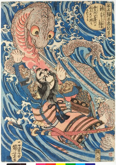 Утагава Куниёси Ханагами Аракагэ, сражающийся с гигантской саламандрой 1840 Принцесса Яэгаки 1852