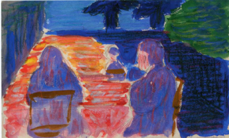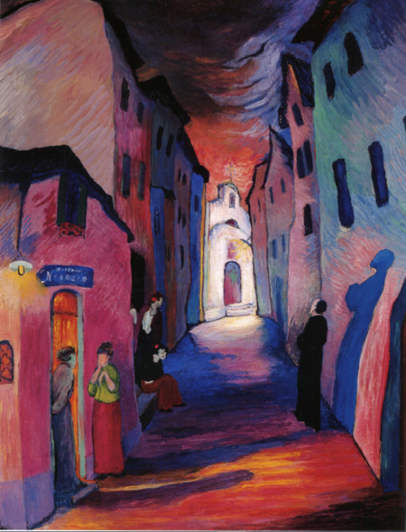 Еще одна картина Марианны Владимировны датирована 1909 годом с изображением бесконечного пути, но более «радостным» состоянием. В то же время мягкость пространства «подчинение» ему фигур, рифмуют картину Веревкиной с «Мунковским миром». Фигуры, как будто плывут по дороге: определенный эффект парения достигается за счет определенного наклона и повторения пятен на одинаковом расстоянии друг от друга.