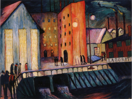 «Огромная оранжевая луна катится, как неимоверный ком в интенсивно-синем. Линии домов обрамляют с двух сторон эту синь в по-детски жесткую рамку. Рождается словно песня цветов, подчиненных этому синему, над которым доминирует оранжевая луна»