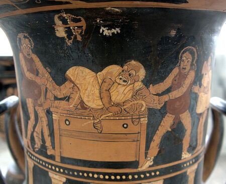 Сцена из флиаки на кратере вазописца Астея из Пестума. Все актеры — в масках. 350-340 гг. до н. э. Мраморный рельеф с изображением драматурга (Менандра), держащего театральную маску