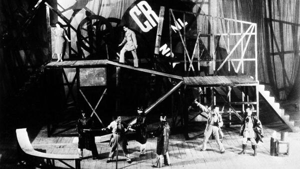 Сцена из спектакля Государственного театра Мейерхольда «Баня» по пьесе Владимира Маяковского (1930) Сцена из спектакля «Великодушный рогоносец» в постановке В. Мейерхольда (1922)