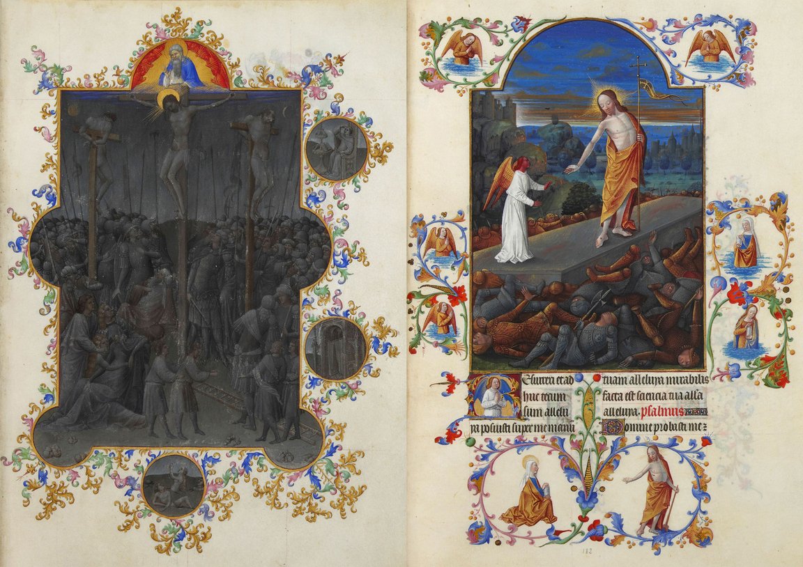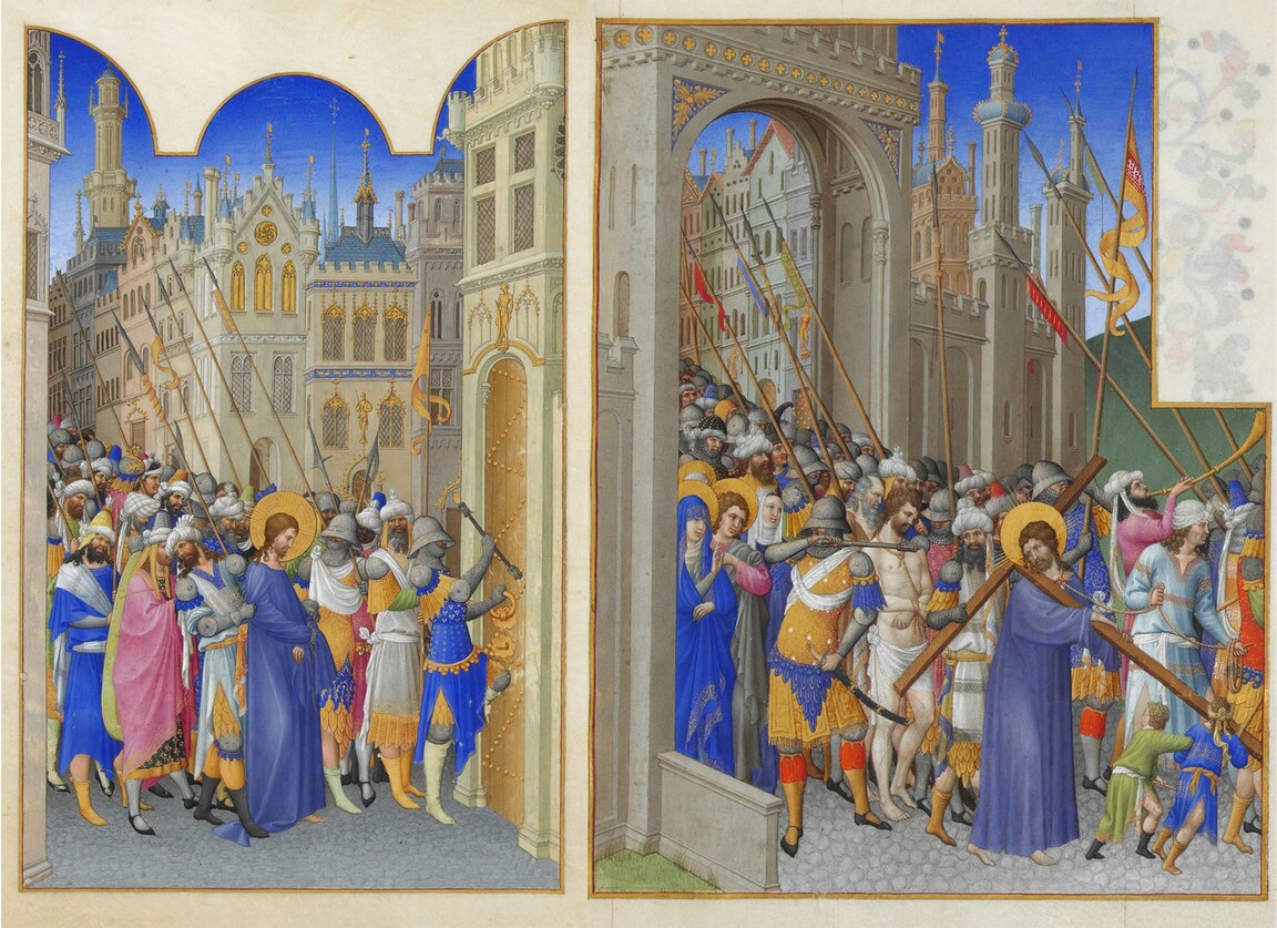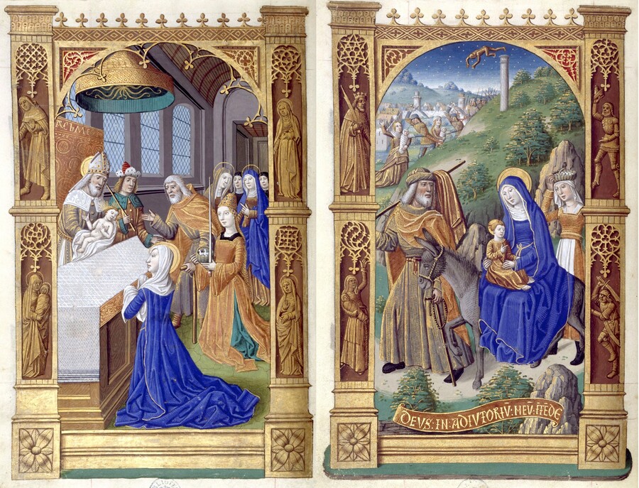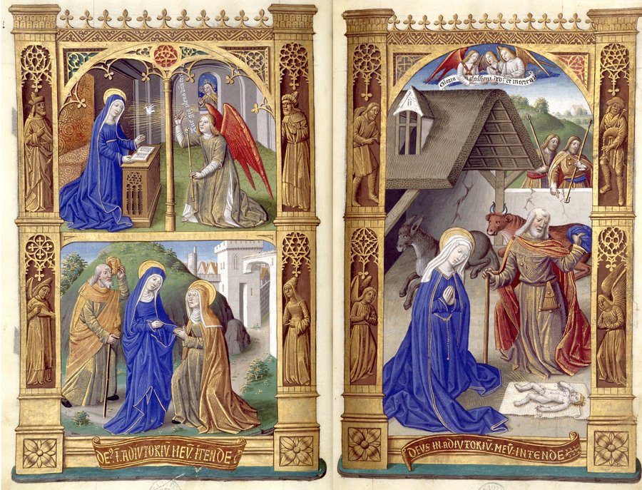 Иллюстрации часословов перенимают сценическую природу мистерий: каждая миниатюра воспринимается как отдельная «сцена» сакрального представления.
