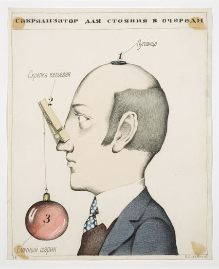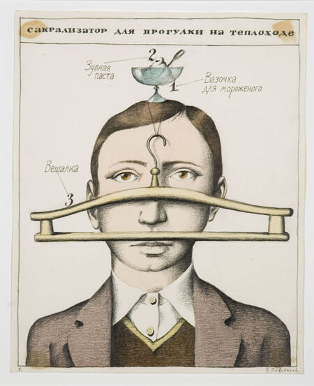 В этих работах текст — это практическая схема, алгоритм, план действия. Слово оттесняет изображение, а иногда полностью заменяет его. Когда я рассматриваю листы «Проектов…», я вижу, что текст здесь — это почти инженерный чертёж внутренней жизни. Он структурирует переживания: что делать, когда одиноко? Как вести себя? Как устроить свой мир? «Konkluze» работает так же: текст фиксирует выводы и правила. Имя серии («выводы, заключение») само задаёт отношение к слову: текст у Пивоварова становится инструментом фиксации мыслей, их визуальным отпечатком. Серия «Сакрализаторы» здесь также органично вписывается: слова оформлены как инструкции или пояснения к «ритуальным» объектам, превращая обычные вещи в особые предметы, с которыми зритель «должен взаимодействовать» согласно тексту. Таким образом, текст формирует структуру и правила восприятия образа.
