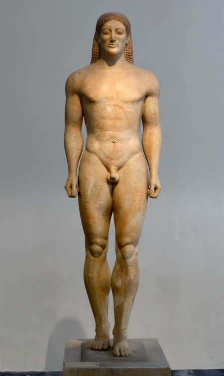 Курос из Суниона — Археологический музей Лавриона; Курос с острова Санторини — Национальный археологический музей Афин.