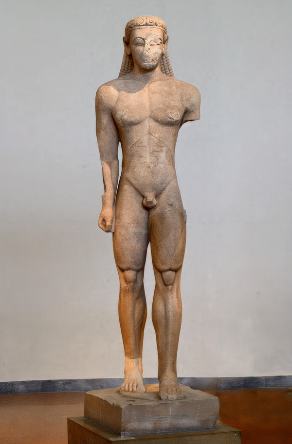 Архаические куросы и коры знаменуют переход от канонической статики к поиску живого движения. Хотя поза куроса остаётся фронтальной, шаг вперёд (как у «Анаксимандрского куроса») представляет попытку выразить динамику. Жесты ещё условны, но внимание к анатомии постепенно увеличивается. Эмоции отсутствуют, однако появляется намёк на телесность, индивидуализацию.