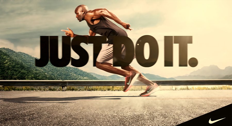 Тексты в рекламе расположены по дуге движения спортсмена, повторяя его траекторию. Слоган на втором плакате расположен на переднем плане, а спортсмен «прорывается» сквозь текст, усиливая ощущение решимости.