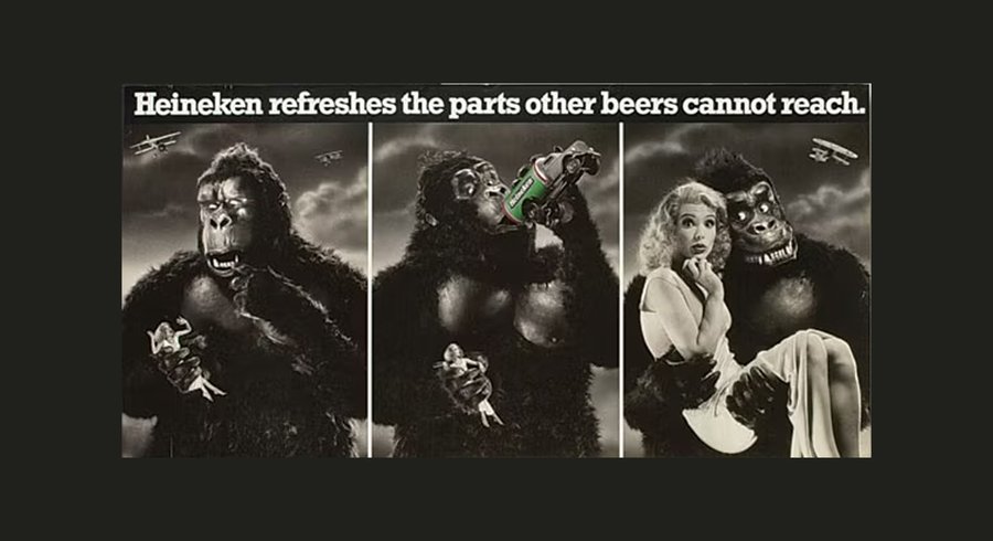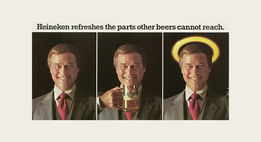 Heineken «освежает те части, до которых другие виды пива не добираются». Обычное действие (выпить пиво) приводит к нереально преувеличенному результату — будто напиток наделяет сверхспособностями и «освежает» даже душу.
