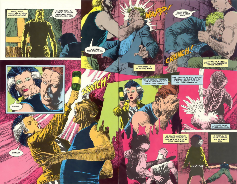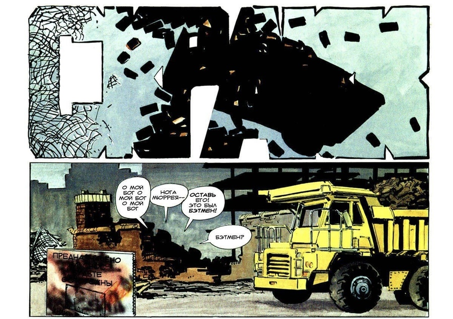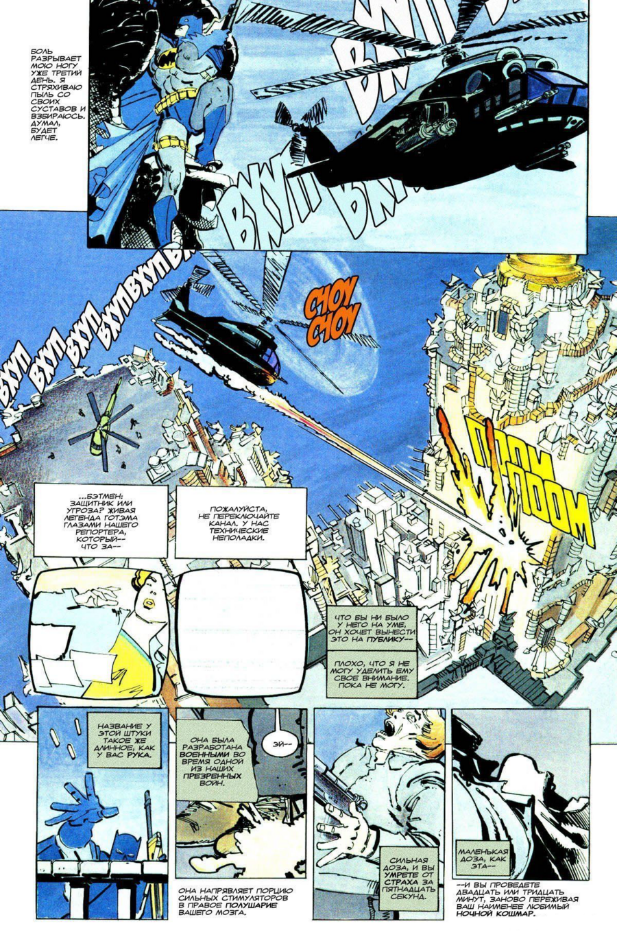 В работах Фрэнка Миллера, особенно в комиксе The Dark Knight Returns, нарушение регулярной сетки становится способом передать резкие всплески действия и эмоциональной агрессии. Там, где привычные прямоугольные панели могли бы поддерживать стабильный ритм чтения, Миллер сознательно разрывает композицию: кадры начинают перекрывать друг друга, границы становятся неровными, а отдельные изображения вырываются за пределы предполагаемой структуры страницы.