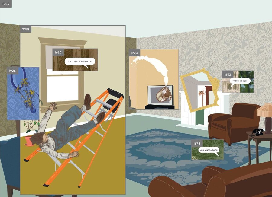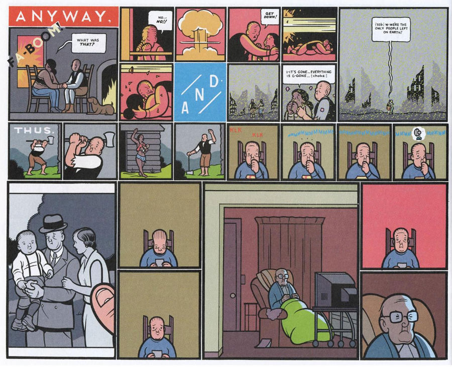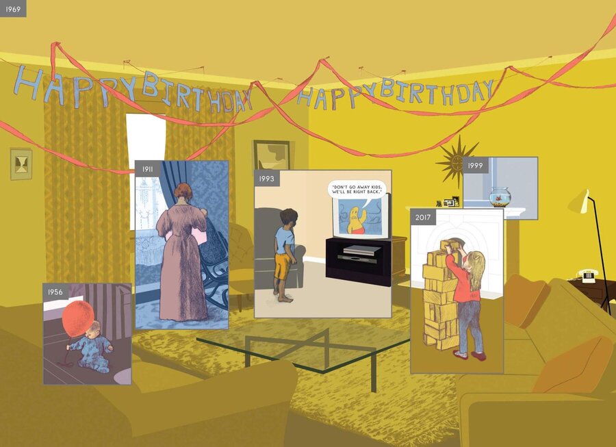 Один из наиболее ярких примеров — Here Ричарда Макгуайра. На страницах комикса изображена всего одна комната, но в каждый момент на ней присутствуют разные годы: от далекого прошлого до будущего. Временные фрагменты буквально вставлены друг в друга, создавая композицию, где прошлое и будущее существуют одновременно. Читатель видит не историю в привычном смысле, а пласт времени, который разворачивается сразу во всех направлениях.