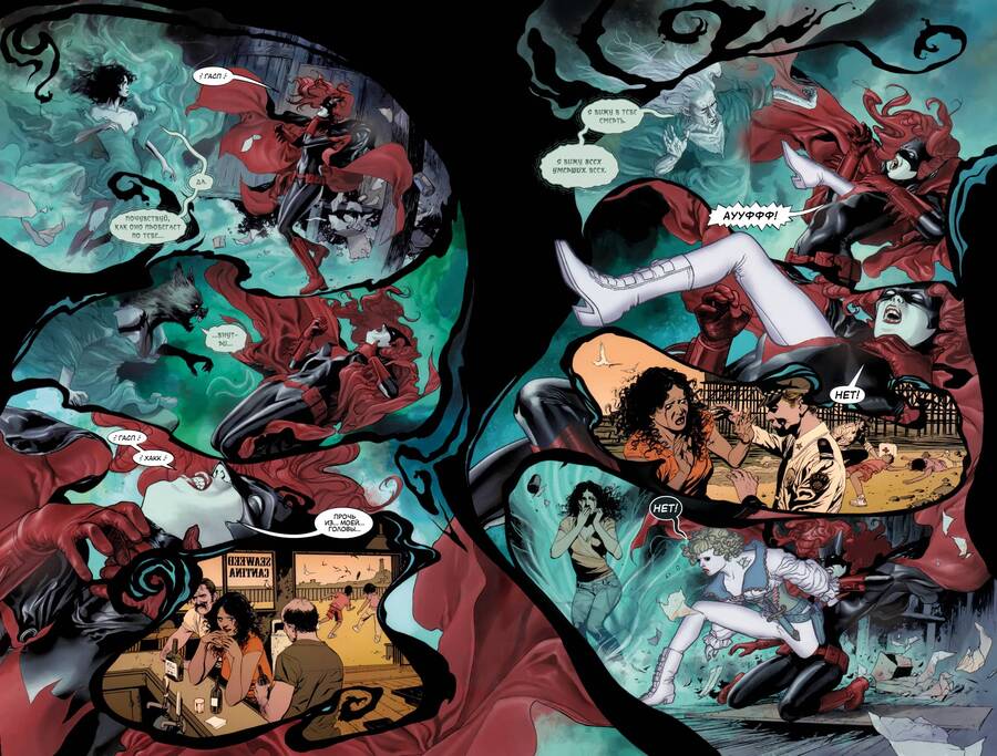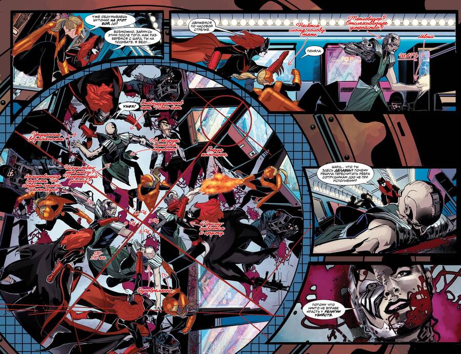 В Batwoman работы Дж. Х. Уильямса III нарушение направленности взгляда становится основой визуального стиля: панели располагаются по круговым или волнообразным траекториям, так что взгляд движется не по прямой, а по волнообразной структуре, композиция словно гипнотизирует. Такой подход создает атмосферу сна, иррациональности и зыбкости, как будто читатель погружается в ту же нереальность, что и героиня.