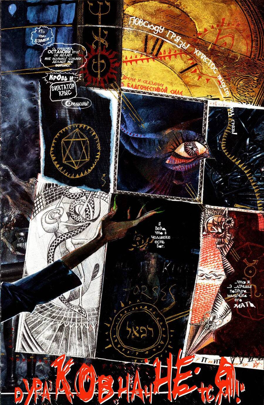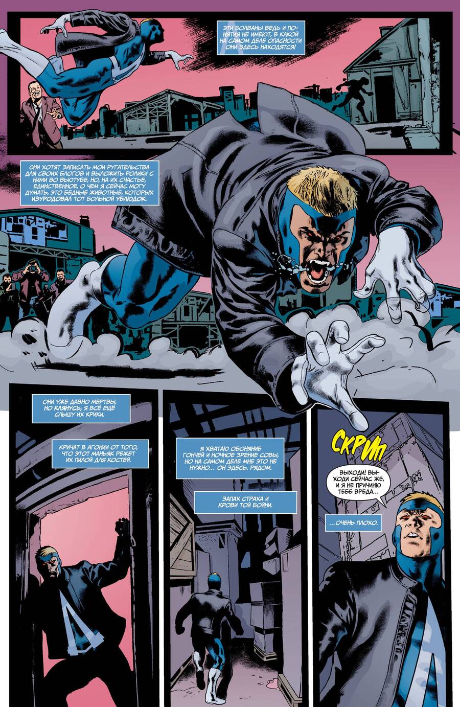 В Animal Man Гранта Моррисона есть момент, когда герой буквально выходит за рамку своей панели и попадает в соседнее пространство страницы. Он больше не заключен в кадр, а как будто делает прыжок наружу. Это показывает, что персонаж начинает осознавать: он является частью вымышленного мира, созданного автором. Такой прием разрушает привычную границу между историей и читателем. Страница перестает быть обычной последовательностью картинок, она становится местом, где герой и сам комикс будто бы понимают свою собственную искусственность. Это делает сцену неожиданной и тревожной, потому что реальность истории вдруг ломается.