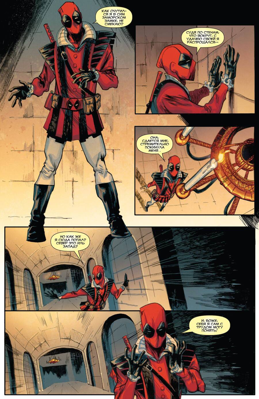 В Deadpool же выход за рамку часто используется как комический и мета-текстовый эффект. Персонаж может высунуться из панели, чтобы прокомментировать происходящее, или взаимодействовать с элементами оформления. Это подчеркивает его осознание собственной вымышленности и создает игровой, самоироничный тон повествования.