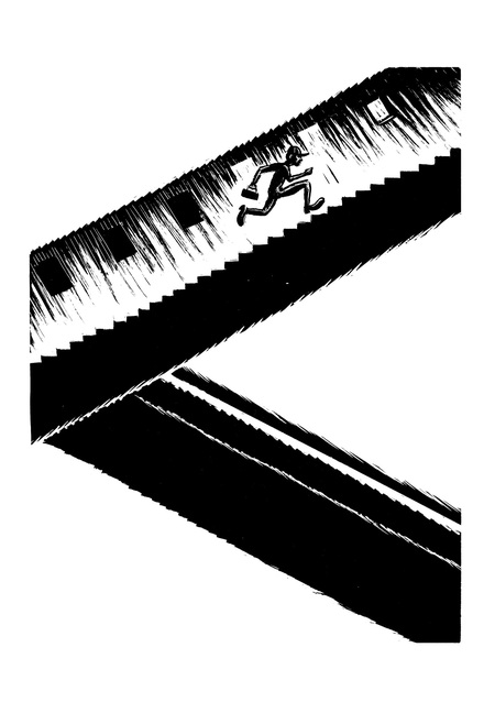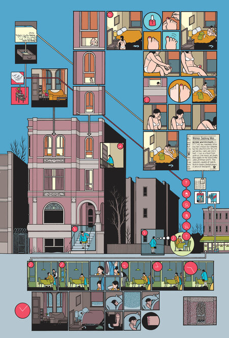 У Криса Уэра в Building Stories этот прием доведен до предела. Страницы нередко представляют собой сложные визуальные конструкции, где нет единственно верного маршрута: читатель должен сам определить, где начать и как двигаться дальше. Это превращает чтение в опыт, близкий к исследованию лабиринта и напрямую перекликается с темой фрагментированности человеческой жизни, которую исследует Уэр. В каждом из этих примеров нарушение привычной линии взгляда используется не как декоративный трюк, а как способ передать дезориентацию, потерянность или внутренний поиск, делая визуальную структуру частью самой истории.