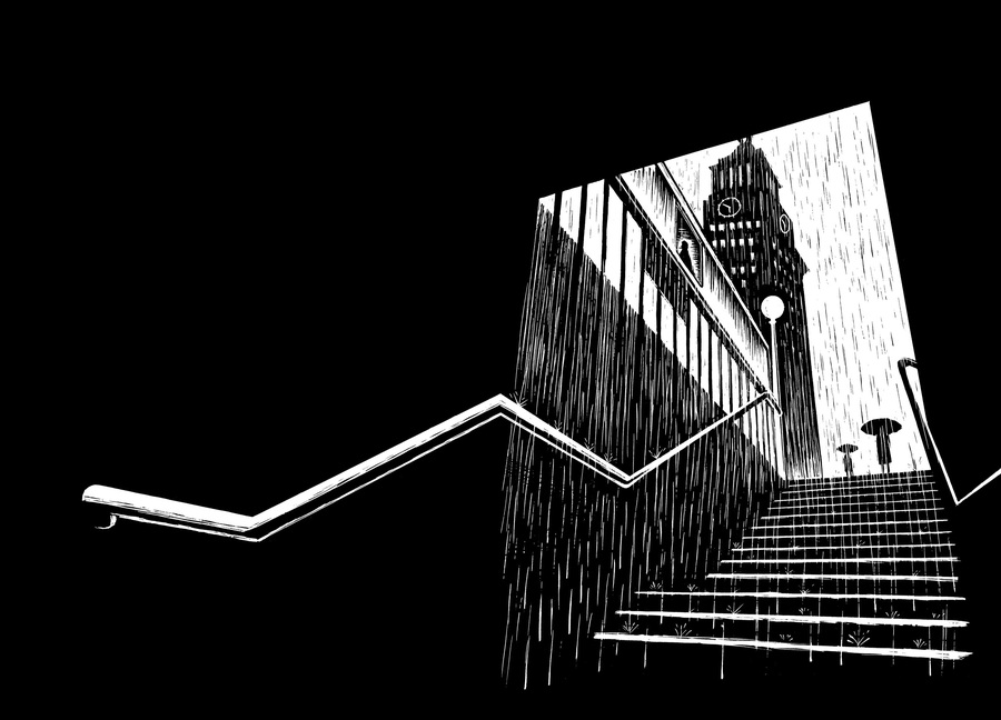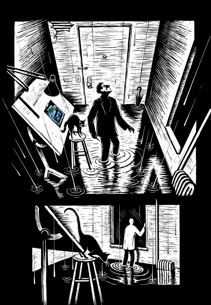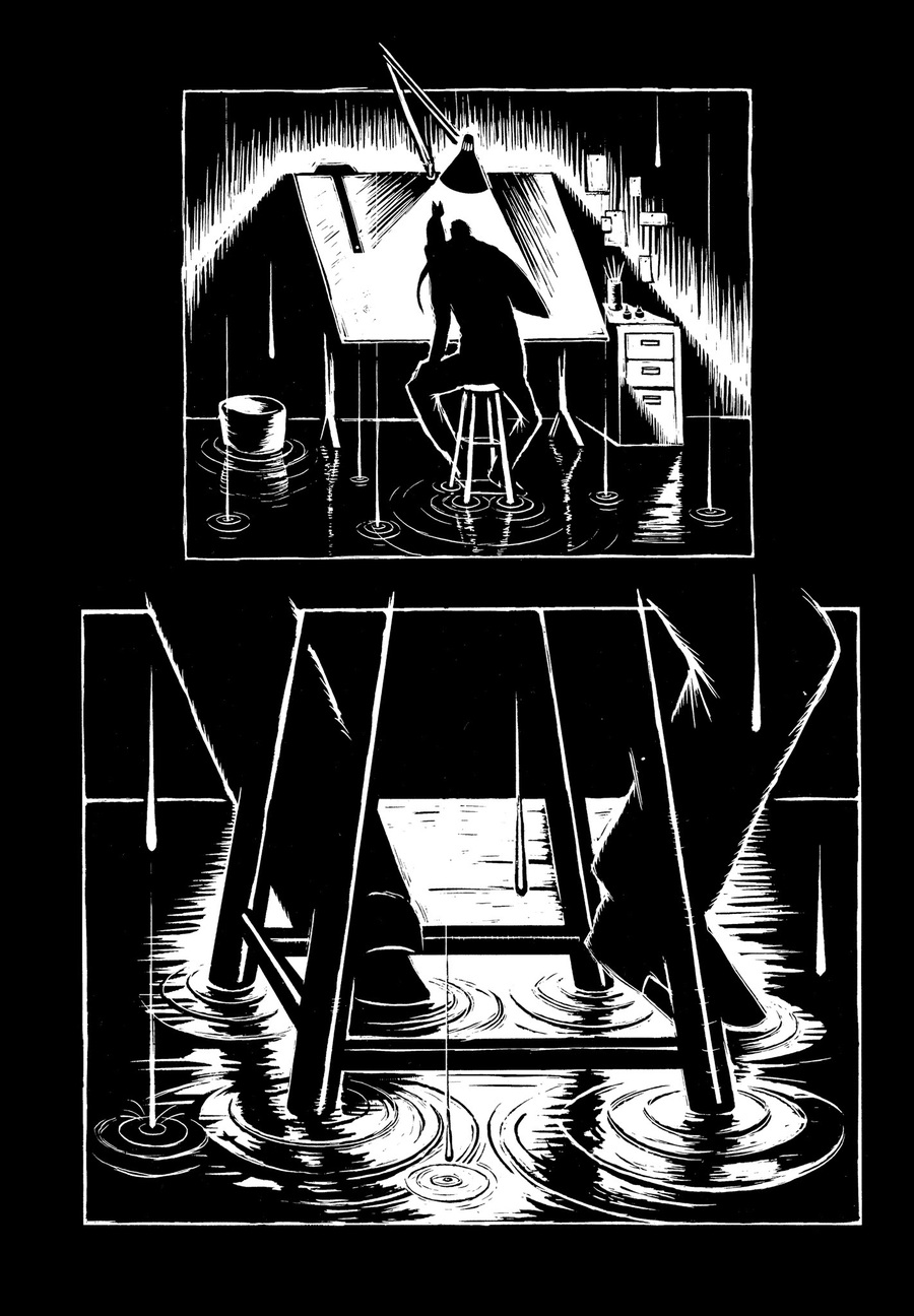 Эрик Друкер в Flood! A Novel in Pictures строит повествование не столько на последовательности событий, сколько на ощущении тревоги, которое сгущается между кадрами. В книге много широких, почти безлюдных пространств: улиц, интерьеров, горизонтов, и именно эти пустоты становятся главным рассказчиком истории.