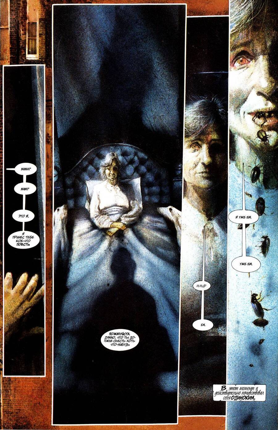 Намеренное смешение разных моментов времени в одной композиции — это прием, который разрушает привычную линейность комикса. Вместо последовательности панелей «сначала — потом» художник помещает события разных периодов рядом, вплотную или даже накладывает их друг на друга. Из-за этого читатель уже не может просто следовать за историей по прямой линии: он должен самостоятельно восстановить цепочку событий, соединить фрагменты и собрать единый временной смысл из отдельных кадров. Такой визуальный сдвиг создает ощущение сна, воспоминания или внутреннего монолога, когда прошлое и настоящее перемешиваются, а время перестает быть упорядоченным. Комикс в этот момент становится не просто рассказом о событиях, а способом показать субъективное восприятие героя, его память, размышления или ощущение потерянности.