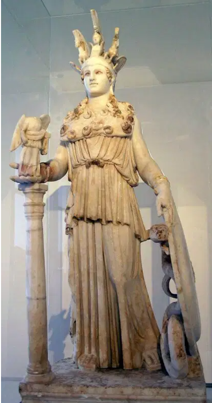 The Varvakeion Athena Parthenos by Phidias, (438 BC), via the National Archaeological Museum, Athens / Red-figured attic hydria, c. 450B.C, via the British Museum, London