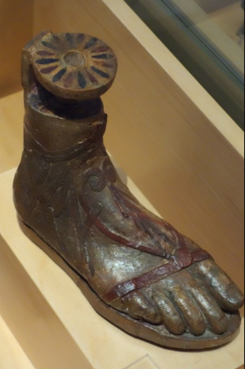 Статуя Артемиды (римская копия) I–II-й, н. э./Греческая бальзамария в форме голени с сандалиями с открытым носком, IV век до н. э. — Музей обуви Бата