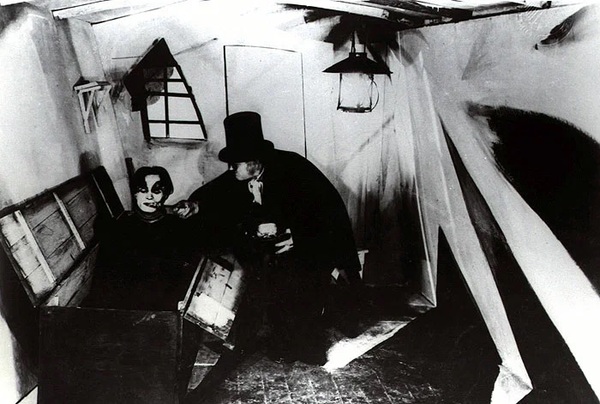 В фильме Роберта Вине «Кабинет доктора Калигари» (1920) архитектурное пространство становится проекцией душевного расстройства. Кривые стены, острые углы и намеренно искаженные перспективы создают ощущение постоянной неустойчивости, что демонстрирует прием тотального визуального искажения. Для первых экспрессионистских фильмов характерны искусственно созданные, нарочито нереалистичные декорации, что ярко проявилось в работе Вине.
