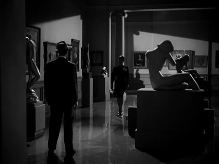 В фильме Генри Хэтэуэя «Тёмный угол» (1946) город показан как система закрытых, ограниченных пространств. Например, в сцене в галерее Манхэттена мраморные колонны и темные уголки создают тревожную атмосферу. Герой кажется одиноким и потерянным на фоне высоких потолков. Эта сцена показывает тему одиночества в большом городе.