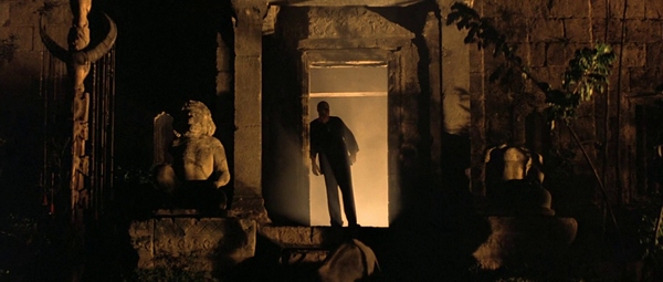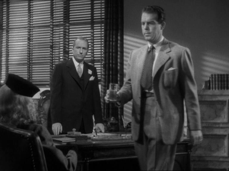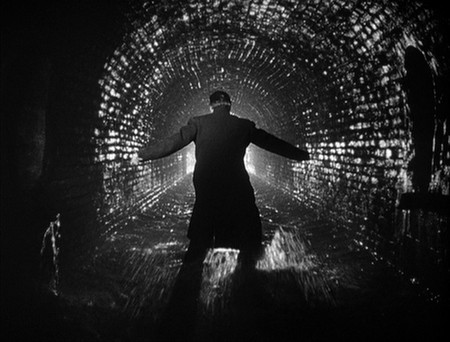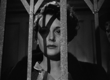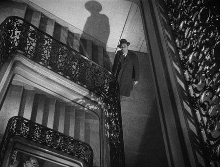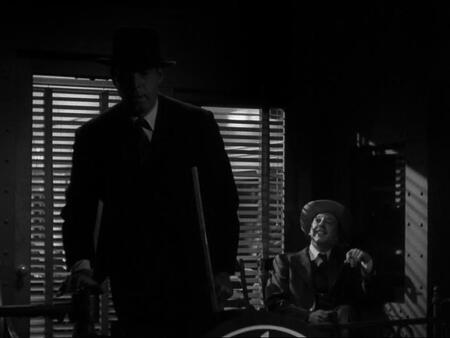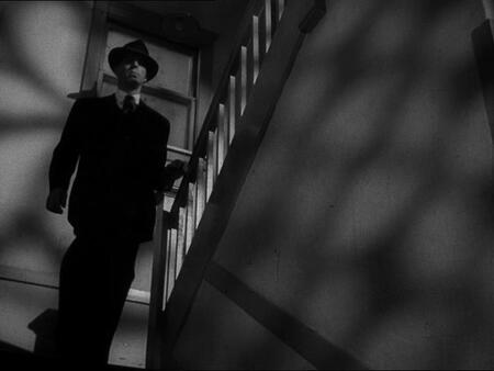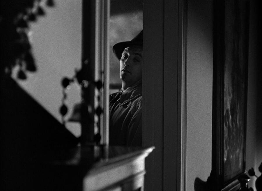 Контраст света и тени в кадре создаёт напряжённую и мрачную атмосферу, характерную для фильмов 40–50-х годов.