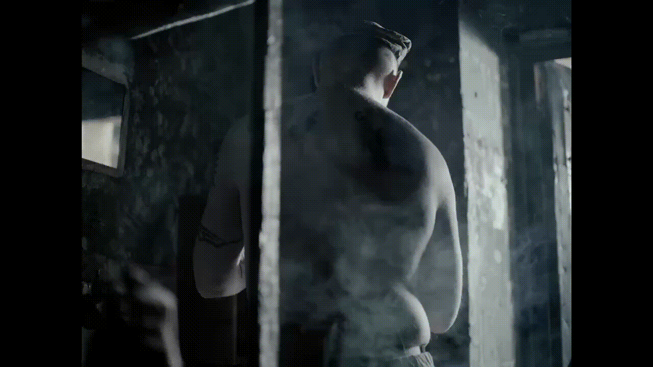 Самый радикальный пример — сцена в «Мне стыдно жить», где зритель буквально смотрит через замочную скважину, пока Слава Копейкин (актёр-двойник артиста) снимает с себя всю одежду до трусов. Кадр длится ровно столько, сколько нужно, чтобы стало невыносимо неловко. Свет приглушённый, камера статична — мы не просто видим голое тело, мы оказываемся в роли того самого «другого», под взглядом которого стыдно всего сильнее.