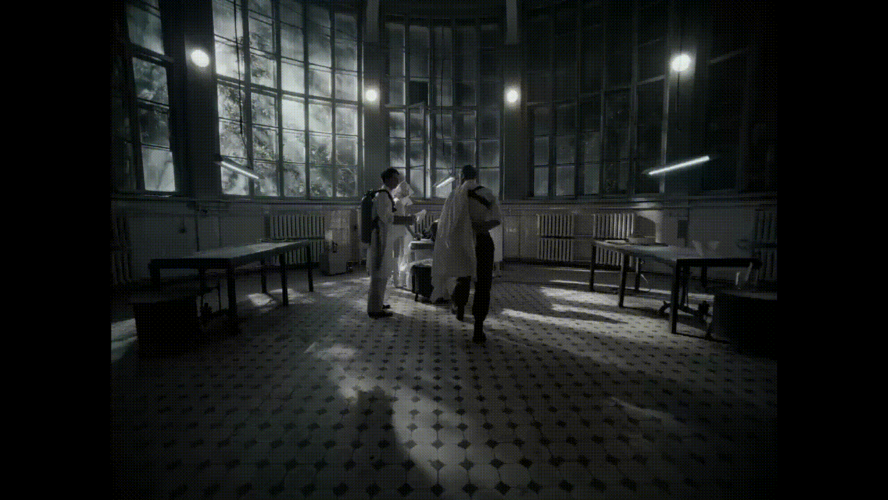 Итоговый кадр пространства — огромное здание с головой Ленина, к которому Слава идёт по мосту над водой.