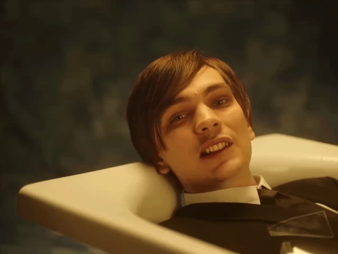 В «Могилам II» травма становится ещё буквальное. Слава лежит в ванне, а люди в масках высыпают на него битое стекло. Стекло падает на грудь, на лицо, на глаза — кожа больше не граница, она первая принимает удар.