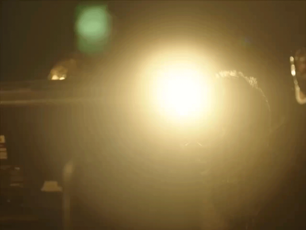 «Жмурюсь от него, как от слишком яркого света» — строчка совпадает с кадром, когда луч бьёт прямо в глаза. Лицо перестаёт быть лицом — становится мишенью.