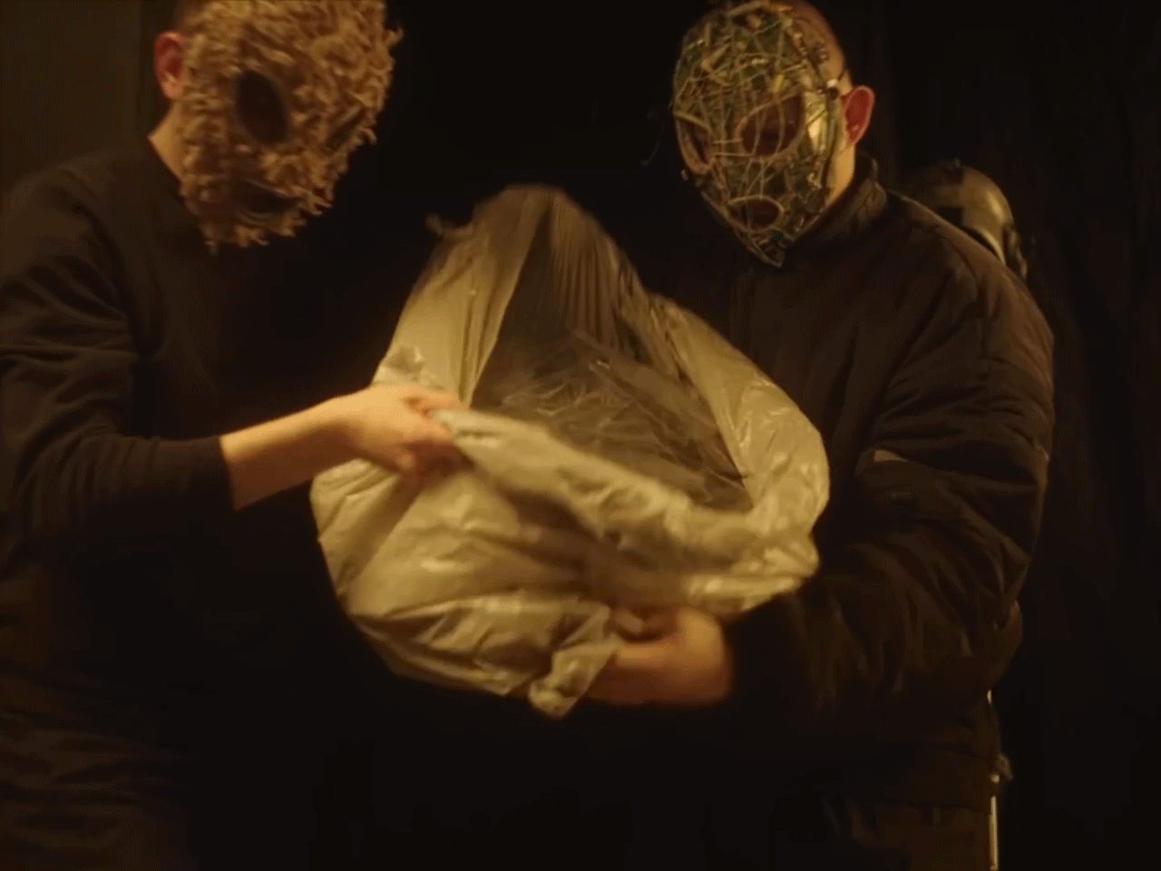 В «Могилам II» лицо скрыто масками окружающих. Люди в масках свиньи и битого стекла стоят над лежащим Славой — их лица нечеловеческие.