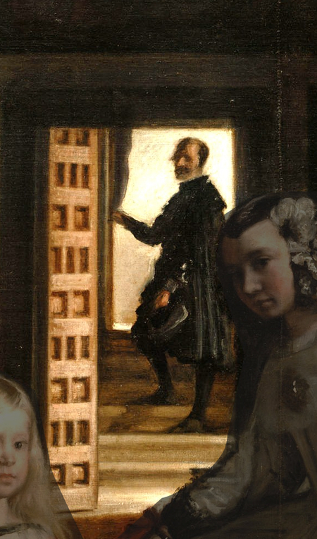 Если присмотреться к организации пространства, «первенство» инфанты оказывается не таким уж бесспорным. Левый край композиции отсекает выдвинутый к зрителю мольберт, и взгляд переходит к светлому пространству, где стоят персонажи. В этом коридоре внимания заметнее всего — фигура гофмаршала в дверном проёме: на фоне ярко освещённой створки его силуэт читается мгновенно, поэтому глаз при взгляде на картину пропускает передний план и уходит к самому акцентному пятну картины — к дверному проему.