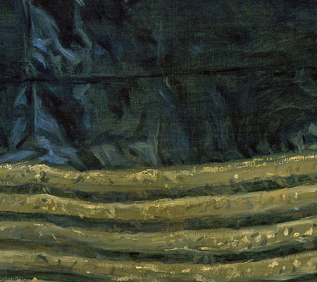 Фактура мазка различается в зависимости от материала: платье написано плотными, местами шероховатыми мазками, создающими впечатление тяжёлой, жёсткой ткани. Волосы, наоборот, переданы более свободно и мягко, с заметными световыми прядями, из-за чего ощущается, что они легкие и детские.