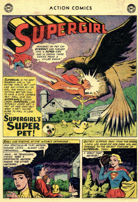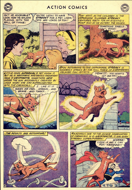 Кроме историй о героях в образе кошки и уличных суперкотах, встречаются комиксы о питомцах известных нам супергероев. Например, о питомце Супергёрл, коте Streaky («Стрики»). Стрики — это домашний кот, который получил свои способности от воздействия криптонита — вымышленного кристаллического радиоактивного вещества, фигурирующего во вселенной DC Comics.