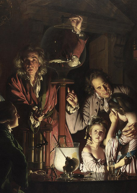 Эксперименты, подобные тому, который изображен на картине, были популярны среди ученых и странствующих лекторов, которые проводили демонстрации для широкой публики. На картине изображён момент, когда учёный проводит эксперимент: он помещает птицу в насос, и все смотрят, как она реагирует на то, что воздуха в насосе нет. Это как бы создаёт напряжение: с одной стороны, интересно, что происходит, а с другой — думаешь, а птице-то каково?