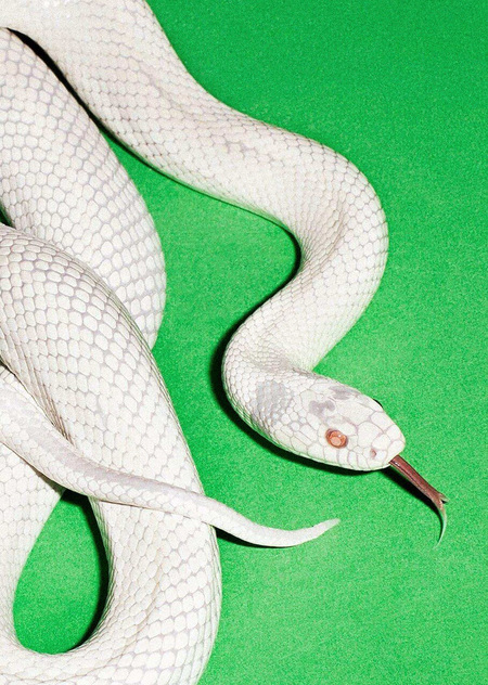 На ярко-зеленом фоне обложки альбома private music (2025) группы Deftones крупным планом выгибается другая рептилия-альбинос — белая змея: ее чешуйчатое тело почти полностью заполняет кадр, четко видны высунутый язык и красные глаза. На уровне эмоциональной метафоры белая змея объединяет несколько ключевых тем альбома: страх, соблазн, скрытое напряжение и стремление к изменению. В треклисте есть, например, ecdysis [4] — термин для линьки, что напрямую отсылает к змее как к образу трансформации, смене оболочки. Детально изображенное на обложке животное кажется опасным, медленно подкрадывающимся к добыче. Но его необычная белая окраска скрывает паттерн колец на теле, характерный для вида Lampropeltis californiae семейства ужеобразных [5], совершенно не ядовитого; так этот животный образ раскрывается в метафору смешения внешней угрозы и внутренней, скрытой нежности.