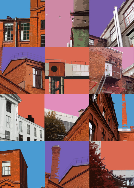 В основе стиля из загруженных 12 иллюстраций лежат трассированные изображения различных частей зданий в Севкабель Порту: кирпич, окна, трубы вместе с чистым небом и деревьями. Полный сет располагается в папке photo на диске.