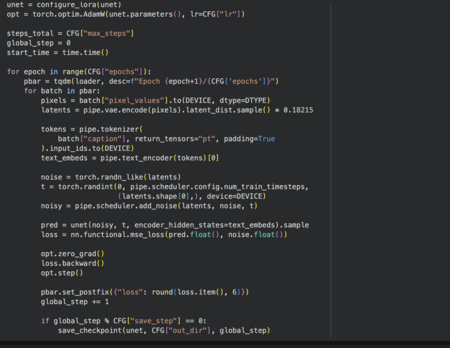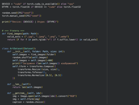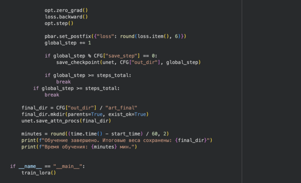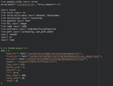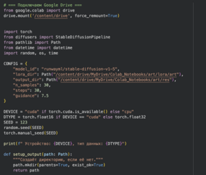 1. Подготовку данных На этом этапе происходит подготовка данных и настройка окружения. В коде: монтирование Google Drive, чтобы получить доступ к необходимым файлам (модель, веса, датасеты). 2. Загрузку предварительно обученной модели и компоненты 3. Применение донастроек (LoRA) 4. Обучение или донастройку модели 5. Генерацию изображений на основе тренированной модели