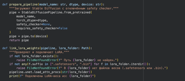 Второй код — процесс генерации изображений, который опирается на подготовленные и загруженные компоненты из первого кода. Он: