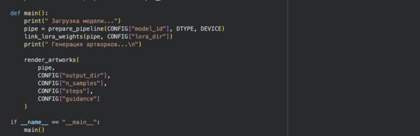Использует уже подготовленную и настроенную модель Определяет параметры генерации (prompt, steps, negative_prompt, seed) Запускает процесс генерации и сохраняет полученные изображения